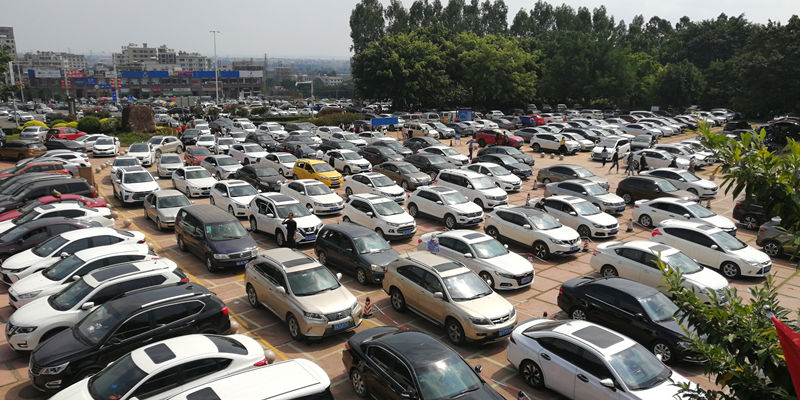 东门广场正在排队购票的自驾车辆有序入园